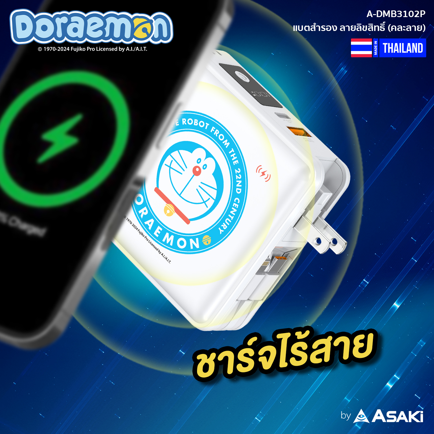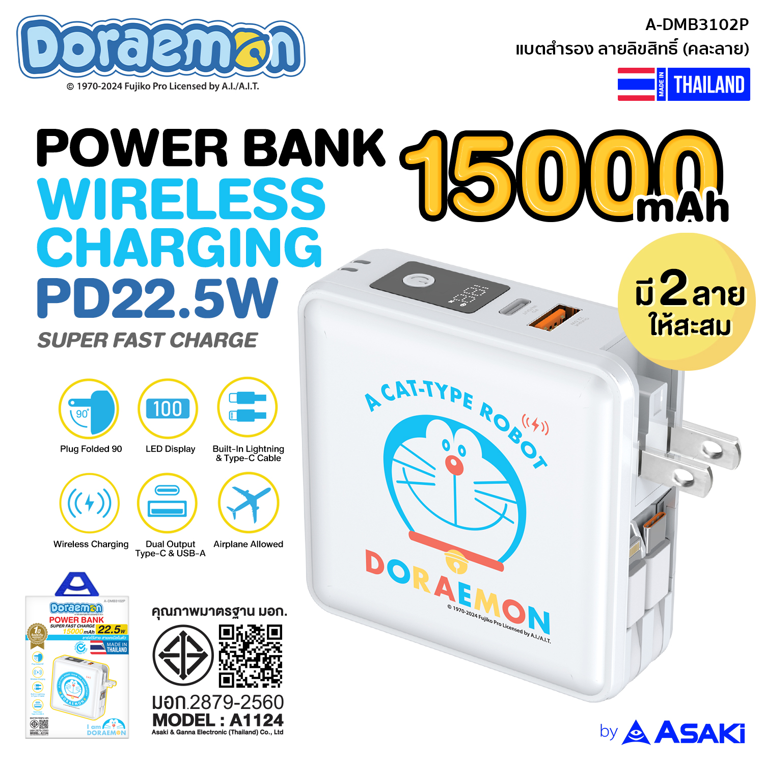 Power Bank 15,000 mAh Asaki A-DMB3102P Doraemon Fast charge 22.5w Digital LED Battery Status, Buil-In 2IN1 Charging Cable, Warranty 1 Year