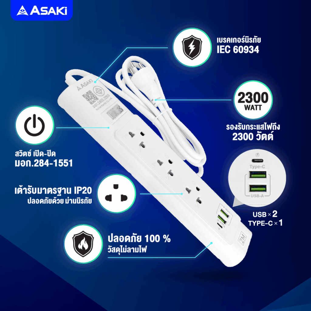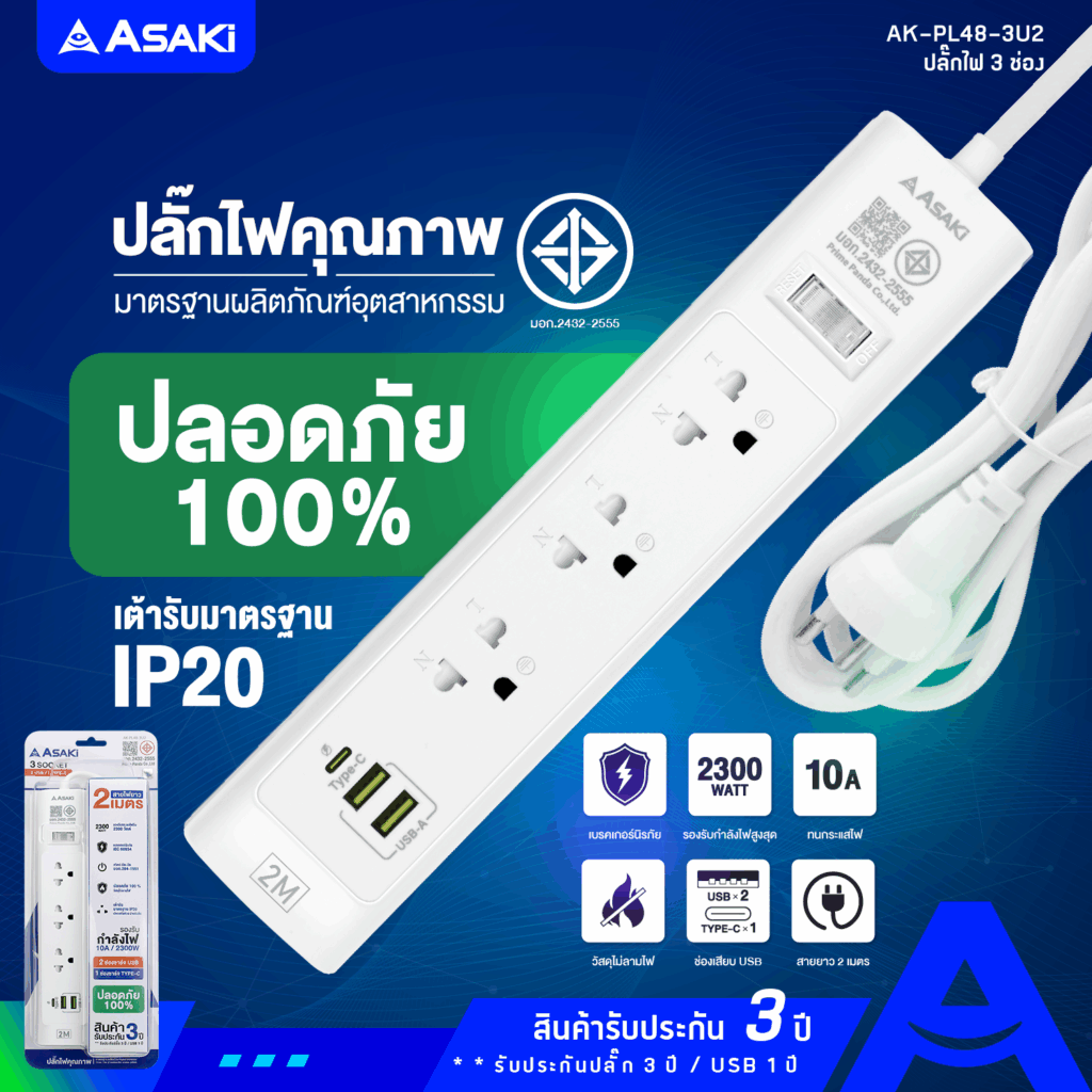 สำหรับผู้ที่กำลังมองหาปลั๊กพ่วงคุณภาพสูงที่เหมาะสมกับการใช้งานหลายอุปกรณ์พร้อมกัน ขอแนะนำปลั๊กพ่วงจากแบรนด์ Asaki รุ่น AK-PL49 และ AK-PL48 ซึ่งมีคุณสมบัติครบถ้วนตามมาตรฐานความปลอดภัยที่กล่าวมา ไม่ว่าจะเป็นระบบเบรกเกอร์ตัดไฟอัตโนมัติ วัสดุทนความร้อนและไม่ลามไฟ มีพอร์ต USB-A และ Type-C ช่วยให้การใช้งานสะดวกและปลอดภัยยิ่งขึ้น