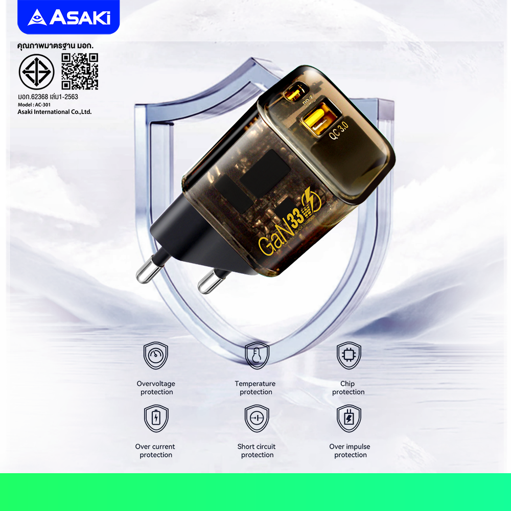 หัวชาร์จคุณภาพดีจาก Asaki เช่น รุ่น A-2431D (33w) เป็นตัวเลือกที่น่าสนใจ เนื่องจากผ่านมาตรฐานสากลและมีระบบความปลอดภัยในตัวครบถ้วน