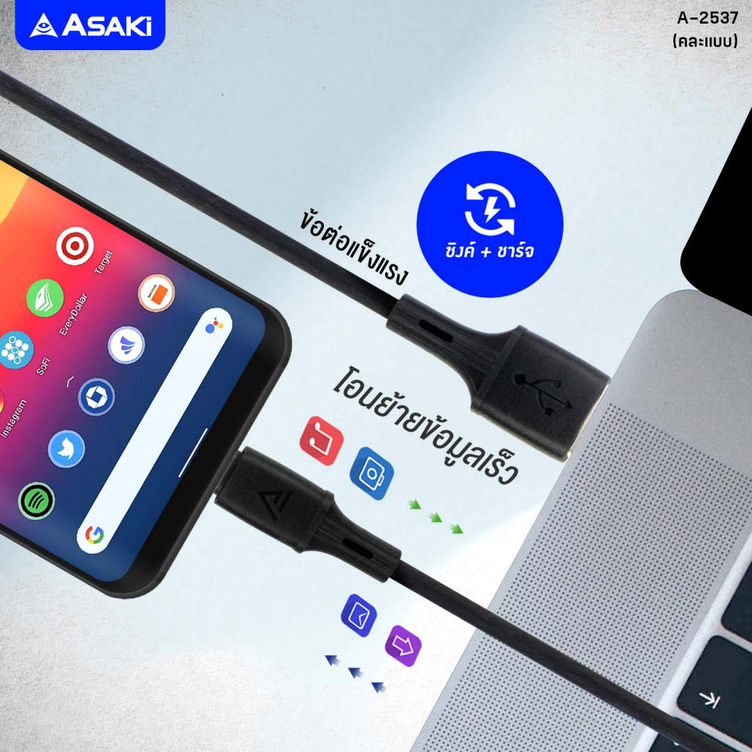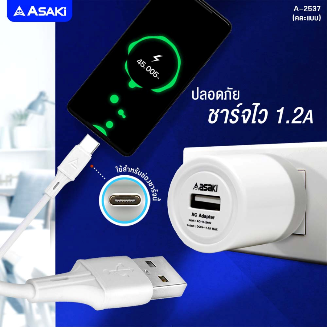 Asaki ชุดชาร์จอเนกประสงค์ อะแดปเตอร์ชาร์จไฟบ้าน และสายชาร์จ Type-C USB รุ่น A-2201