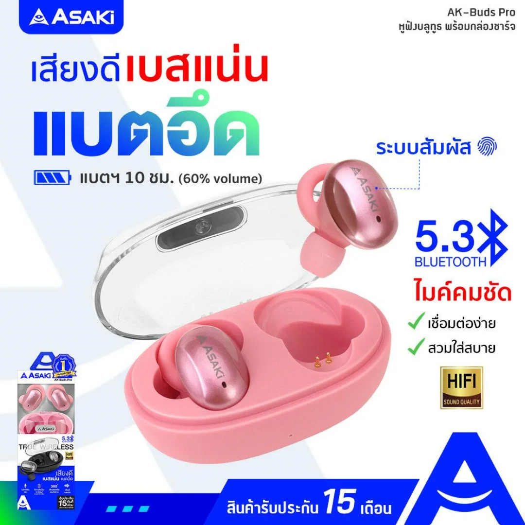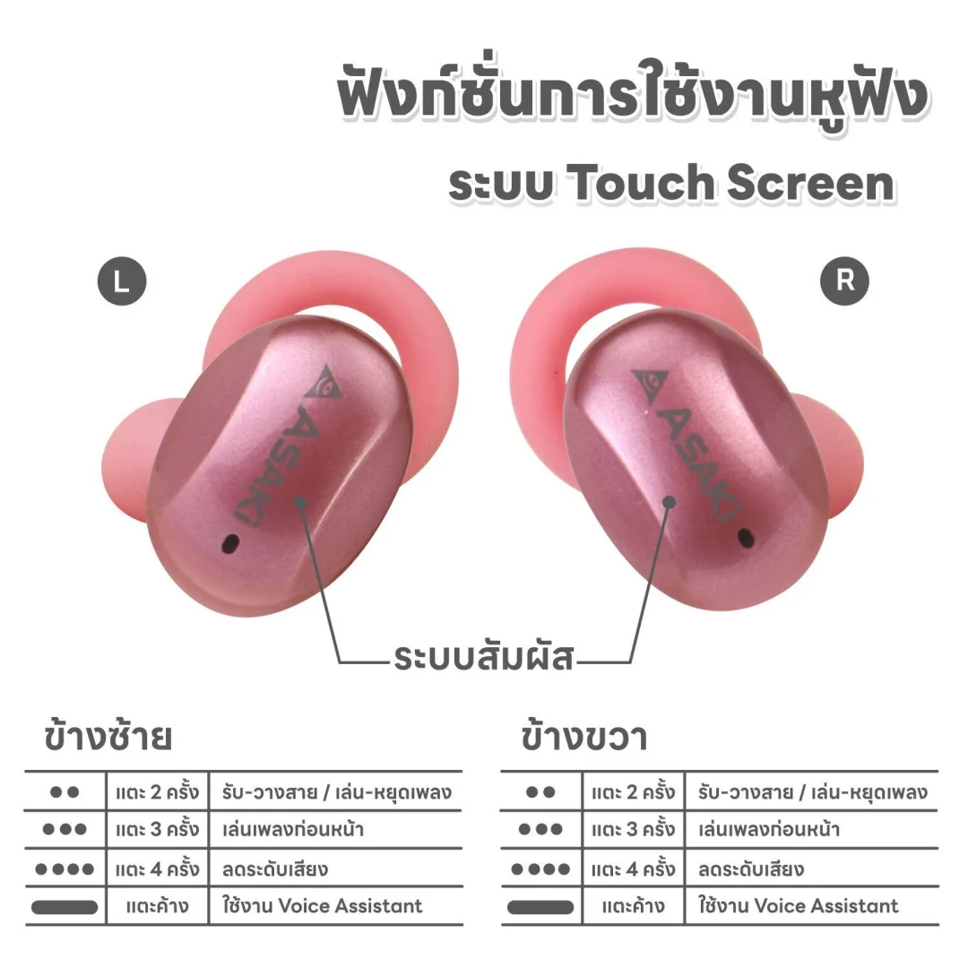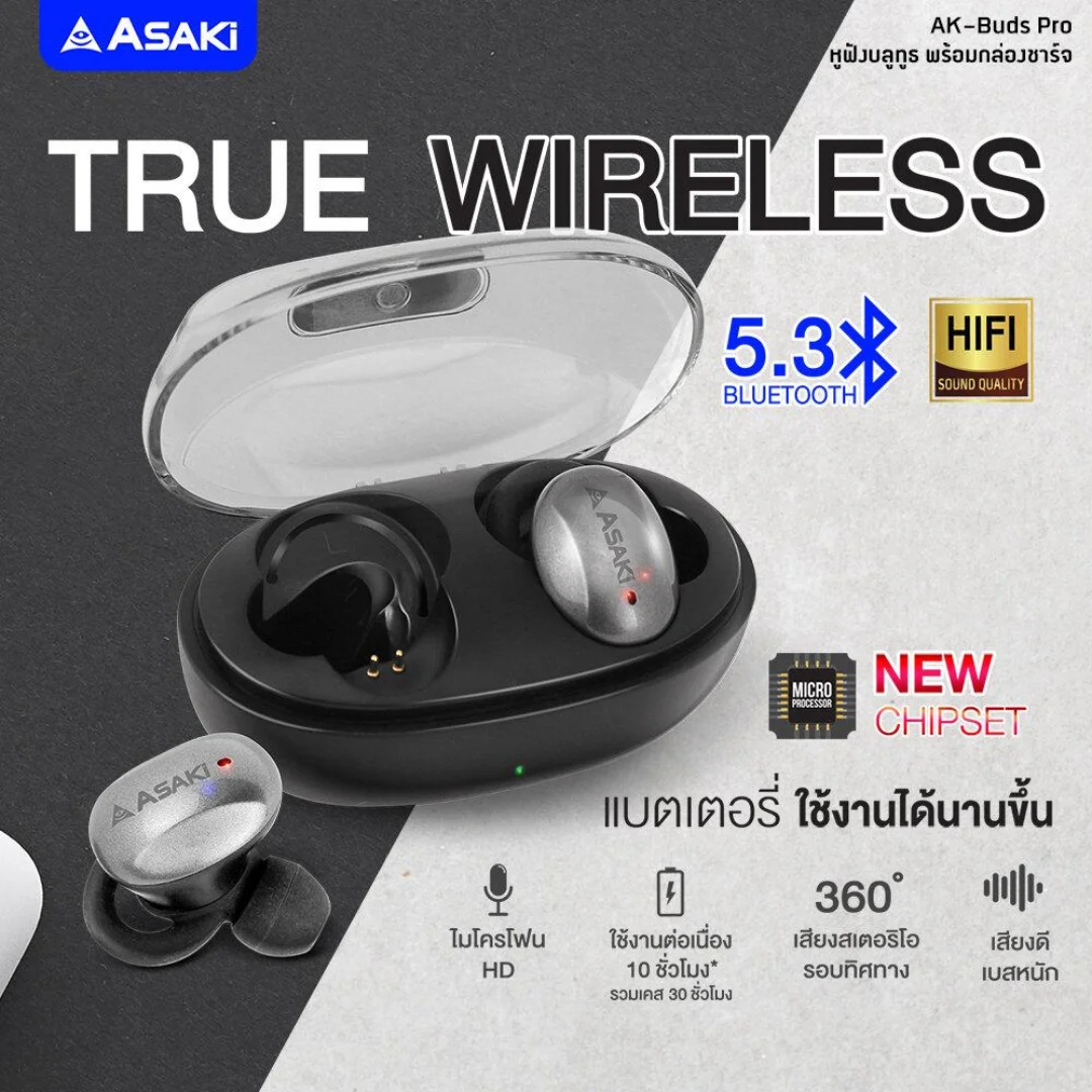 TrueWireless ทรูไวเลส หูฟังบลูทูธไร้สาย Asaki AK-Ait Lite รับประกัน 1 ปี ระบบสัมผัส แบตอึด ใช้ได้นาน ไมค์ในตัว เสียงดัง เบสหนัก