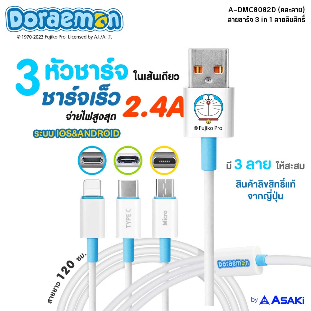 สายชาร์จ 3IN1จ่ายไฟ 2.4A สายยาว 1.2 เมตร ดีไซน์ด้วยสายซิลิโคนหนา แข็งแรง ทนทาน