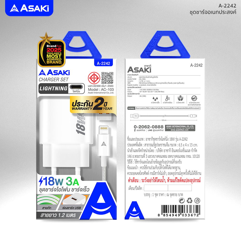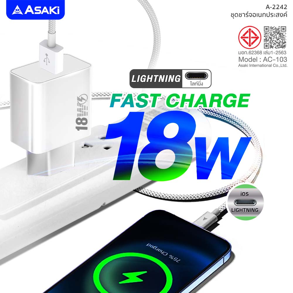 Asaki ที่ชาร์จอเนกประสงค์ หัวชาร์จไฟบ้าน และสายชาร์จ Lightning รุ่น A-2656