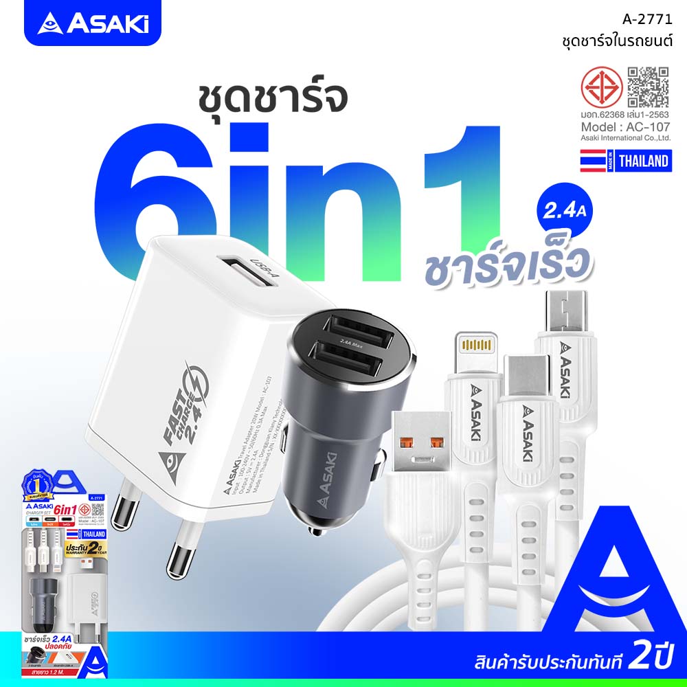 Asaki ชุดชาร์จอเนกประสงค์ อะแดปเตอร์ชาร์จไฟบ้าน และสายชาร์จ Lightning USB รุ่น A-2530