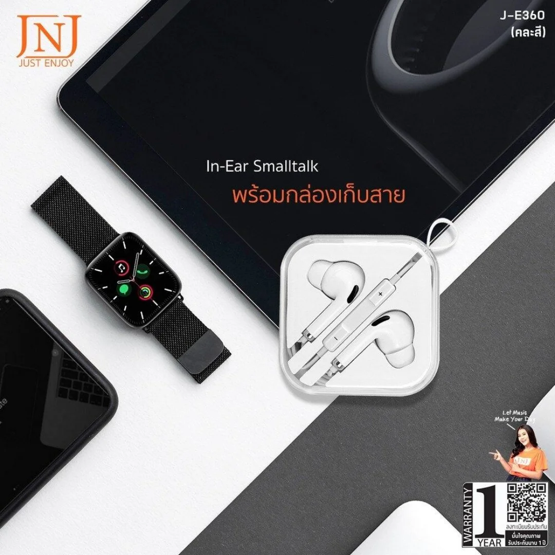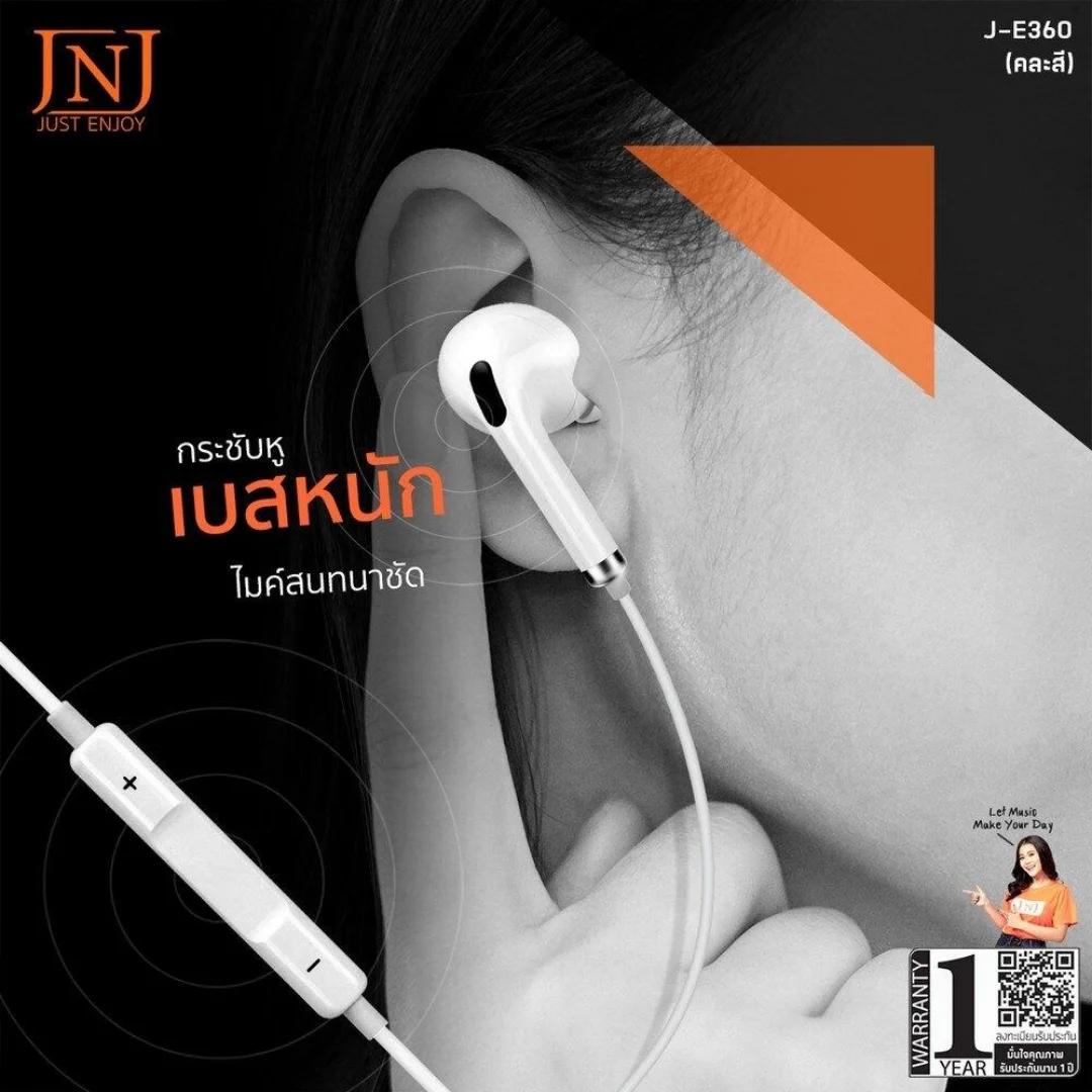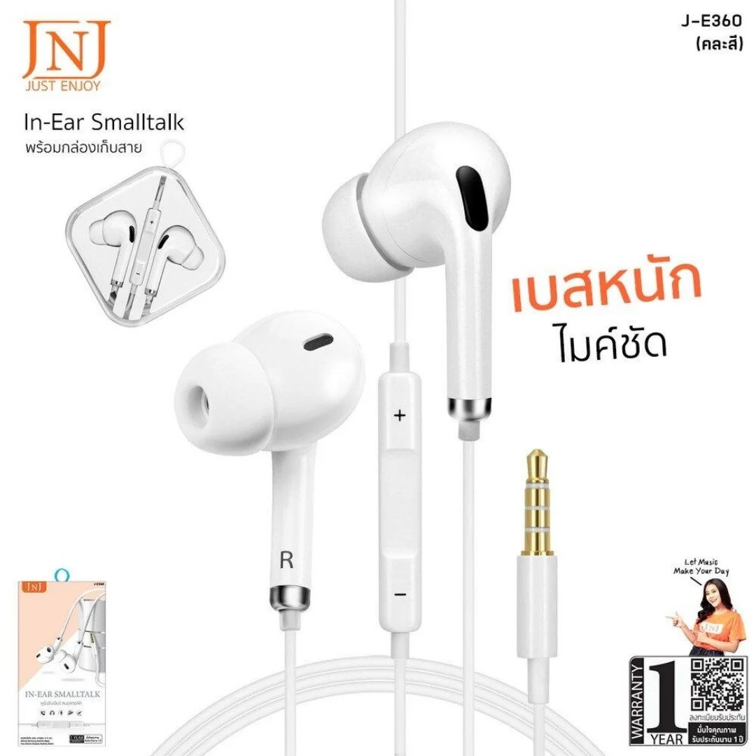 JNJ J-E380 คือหูฟังเอียร์โฟนที่รวมเสียงดนตรีครบย่าน 20 Hz–20 kHz กับเสียงสนทนาชัดเจนไว้ในตัวเดียว ไดรเวอร์ขนาด 14.2 มม. ให้เบสแน่นและรายละเอียดเสียงสมจริง ขั้วต่อสเตอริโอ 3.5 มม. มาตรฐาน เชื่อมต่อได้หลากอุปกรณ์ ส่วนไมโครโฟนในตัวตอบสนอง 50 Hz–8 kHz พร้อมรีโมทควบคุมรับสาย เล่น/หยุดเพลง และปรับระดับเสียงได้ สายยาว 1.2 เมตร คล่องตัวทุกการพกพา เหมาะทั้งฟังเพลง ดูวิดีโอ และคุยโทรศัพท์ทุกวัน