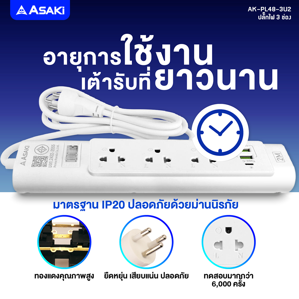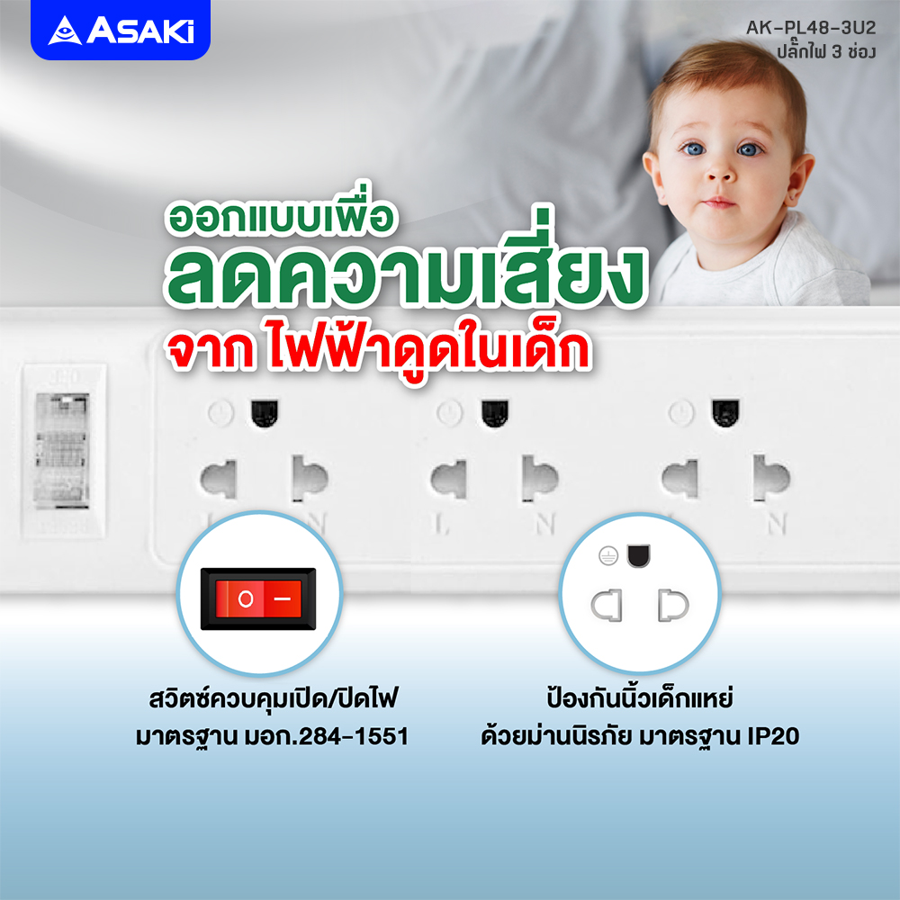 - เต้ารับแบบมีม่านนิรภัย ผลิตจากวัสดุที่ไม่ลามไฟ หัวปลั๊ก 3 ขา มีฉนวนหุ้ม 2 ขา