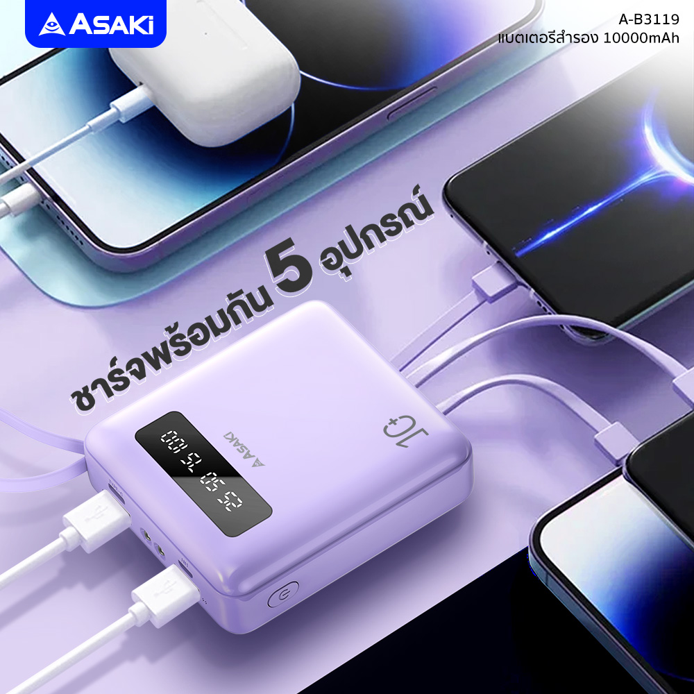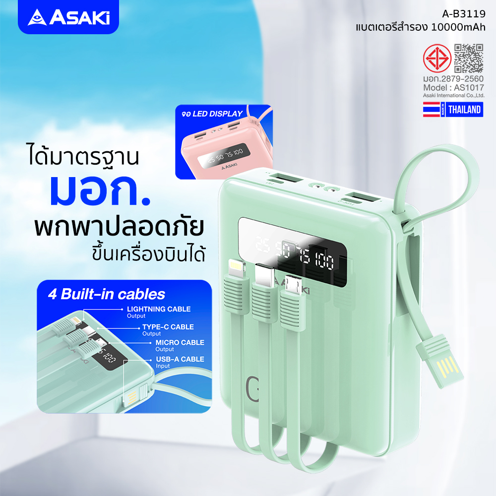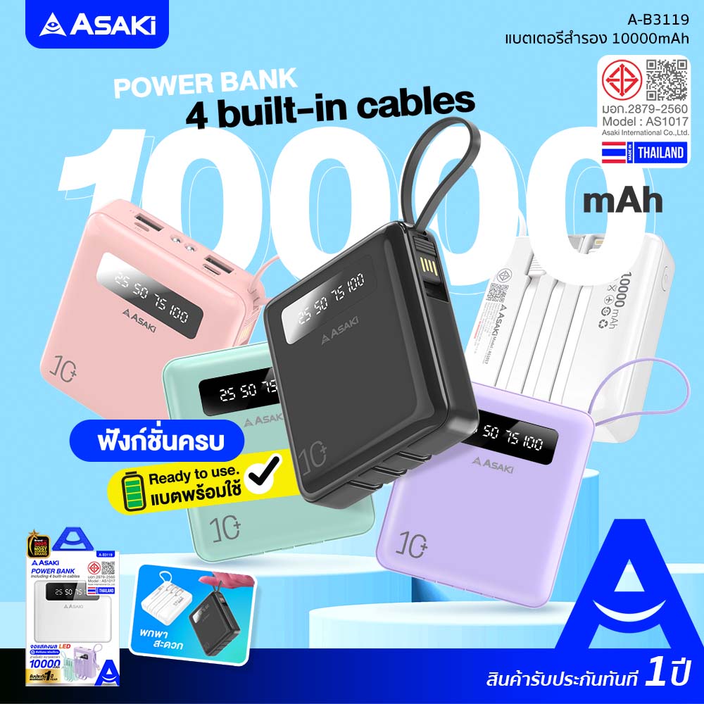 พาวเวอร์แบงค์พร้อมสายในตัว สะดวกกว่าเดิม Power bank รุ่น A-B3564 รวมสาย 4 แบบไว้ในเครื่องเดียว (Lightning, Micro, Type-C และ USB-A) ช่วยให้คุณชาร์จสมาร์ทโฟนหรือแก็ดเจ็ตได้ทันที ไม่ต้องพกสายเพิ่ม ความจุ 10,000 mAh จ่ายกระแสสูง 2A จึงเป็น พาวเวอร์แบงค์ชาร์จเร็ว ที่ตอบโจทย์คนเดินทาง ตัวเครื่องบางเบา มีหน้าจอ LED แสดงเปอร์เซ็นต์แบตชัดเจน ทำให้รุ่นนี้เป็น พาวเวอร์แบงค์ คู่ใจสำหรับทุกวันของคุณ