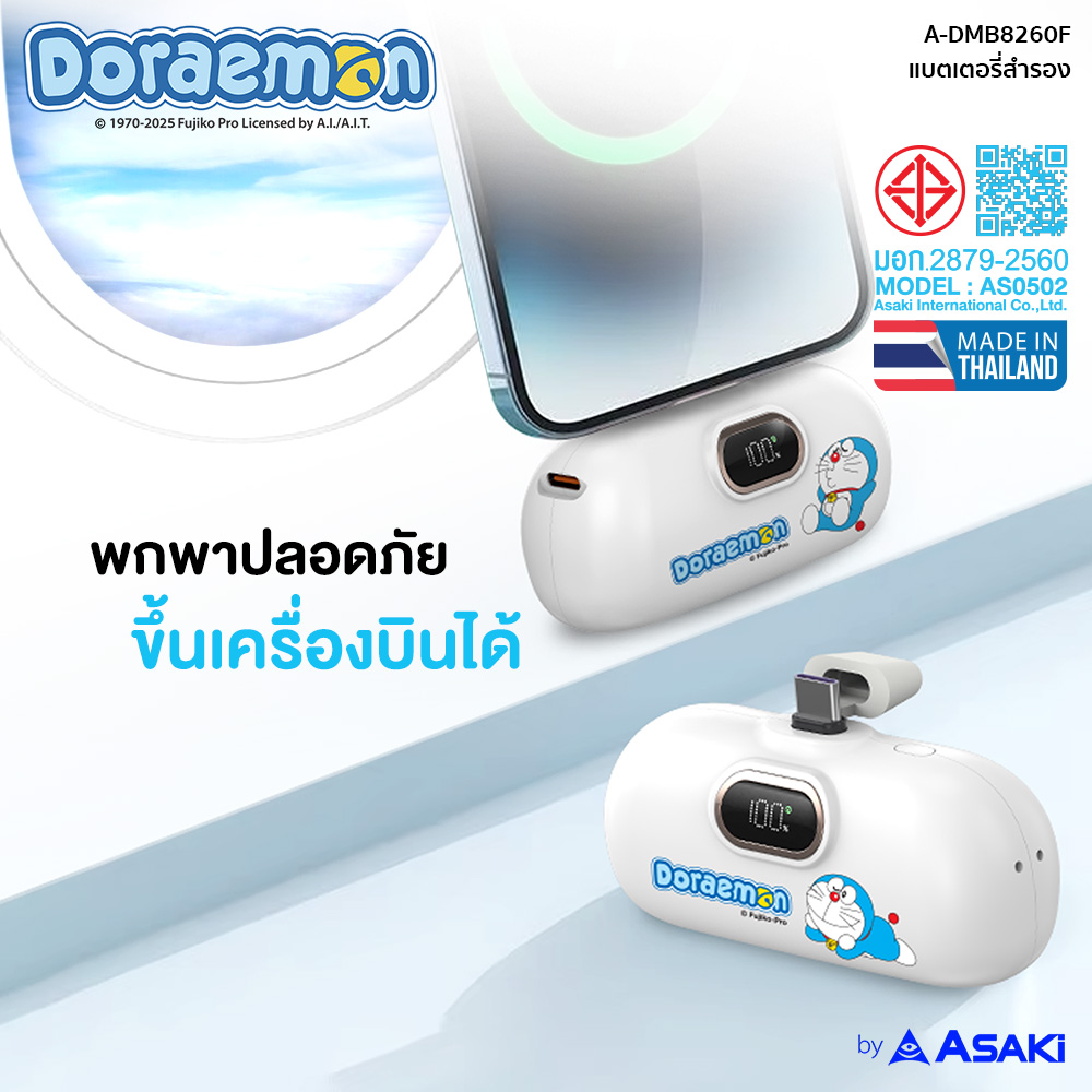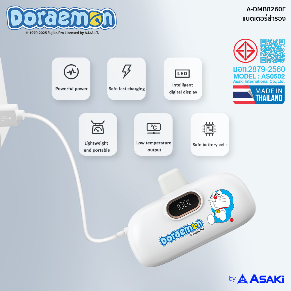 Doraemon Powerbank ความจุ 15000 mAh ลิขสิทธิ์แท้ ชาร์จเร็ว 22.5w พร้อมสายชาร์จ 2IN1 ในตัว (Type-C / Lightning) ได้รับมาตรฐาน มอก. ใช้งานปลอดภัย