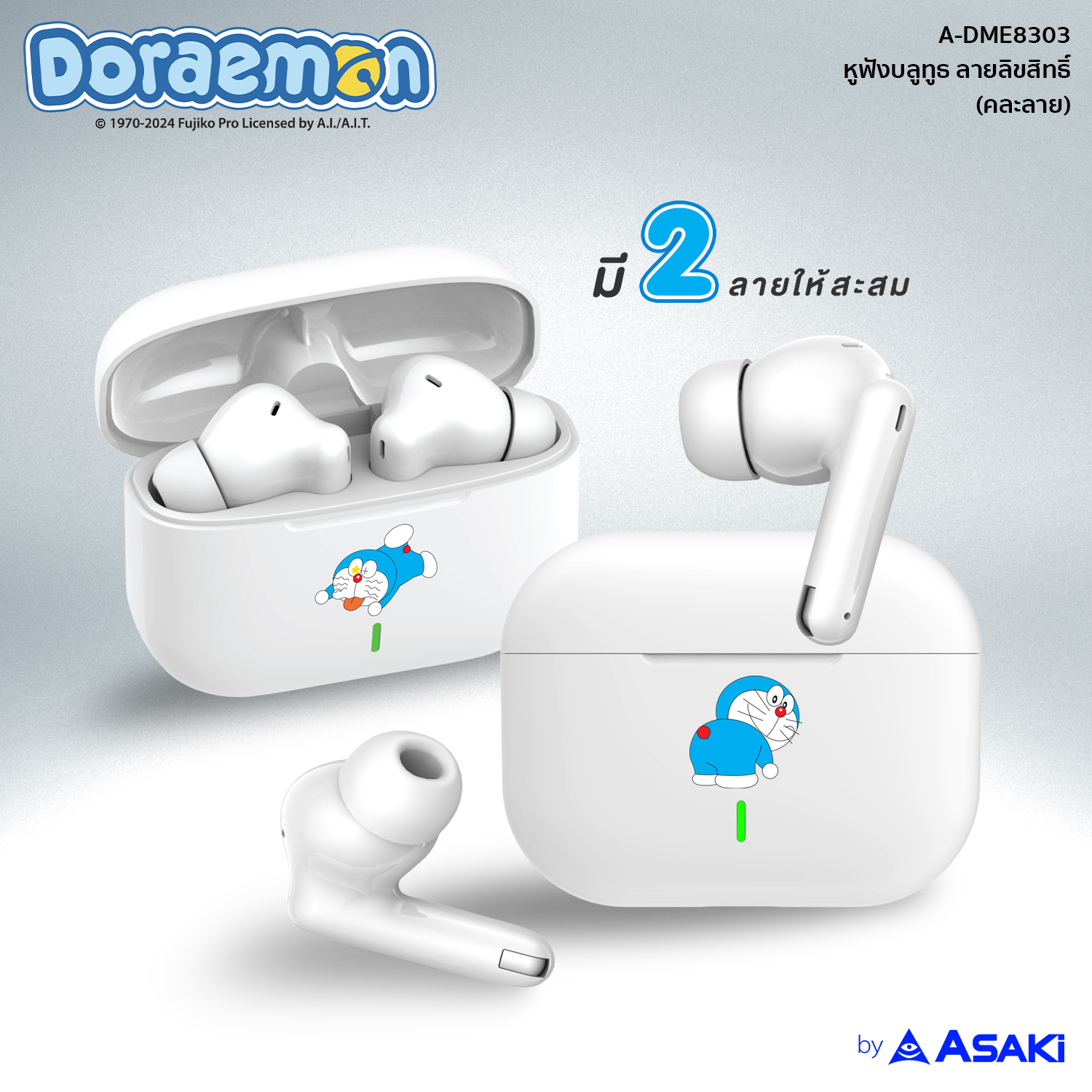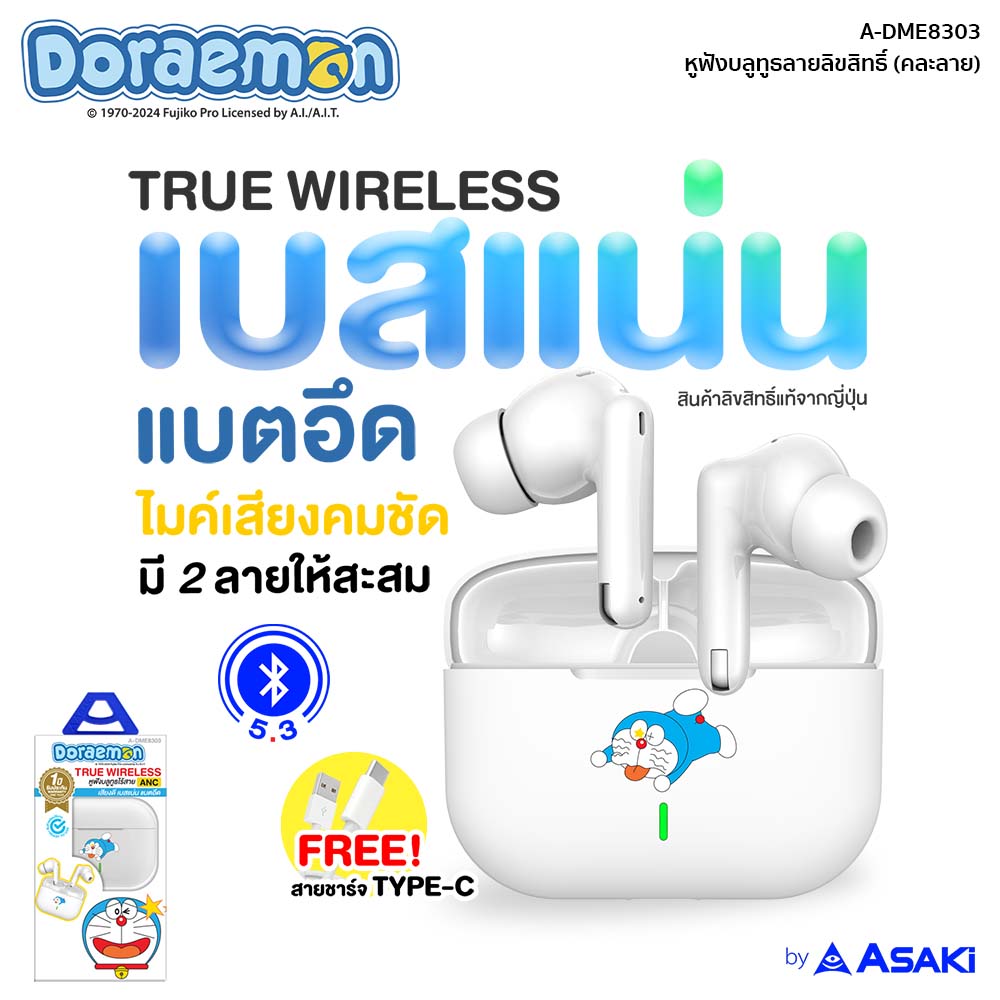 True wireless หูฟังบลูทูธพร้อมกล่องชาร์จ เชื่อมต่อด้วยบลูทูธ 5.3 ไมโครโฟน HD ในตัว เสียงเสตอริโอรอบทิศทาง สกรีนลายลิขสิทธิ์แท้ลาย Doraemon